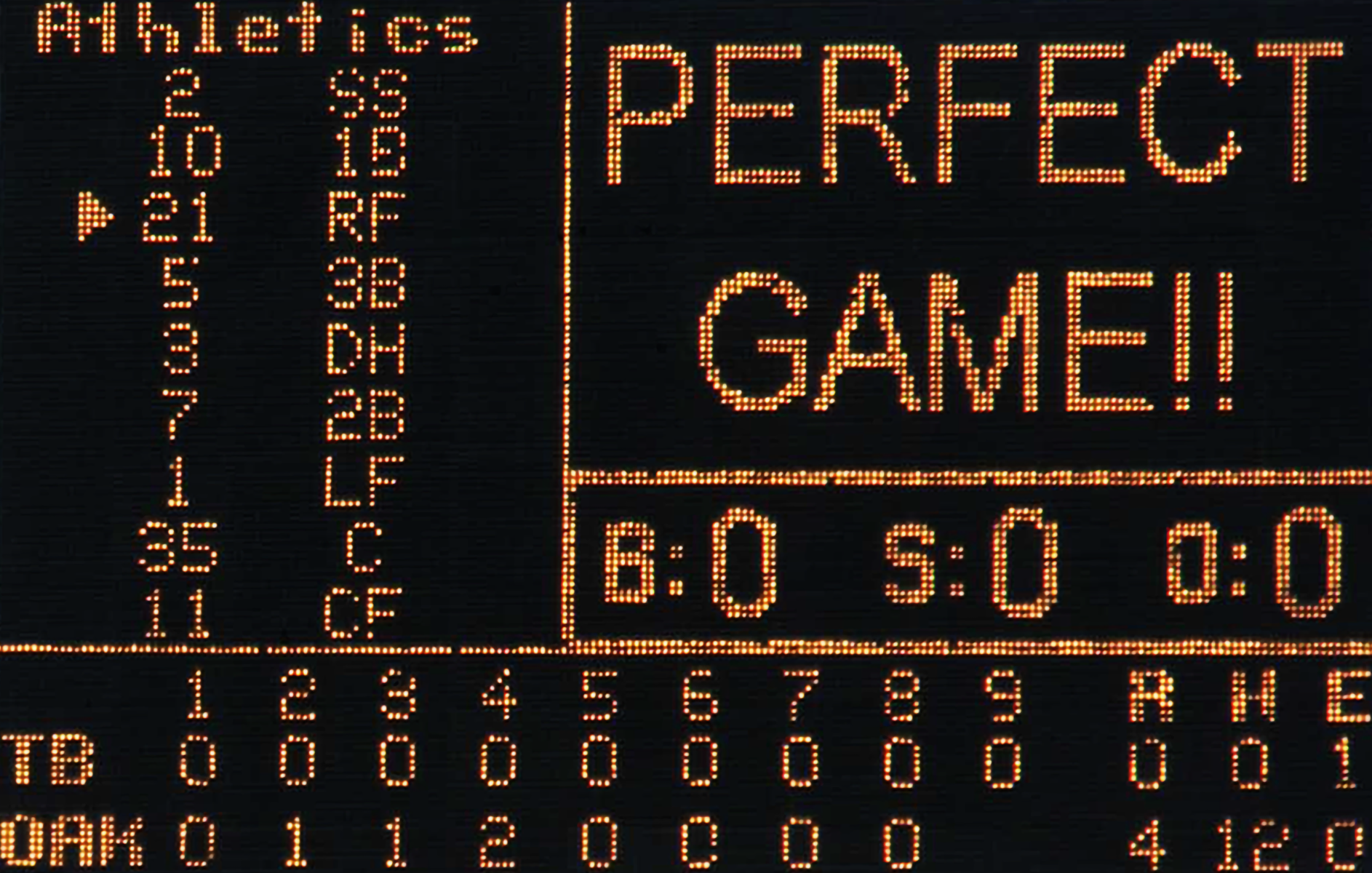 Enjoy this original photo print commemorating Dallas Braden's historic Mother's Day Perfect Game. This photograph of the actual scoreboard was provided by the Wesler family, who were in attendance for this game.